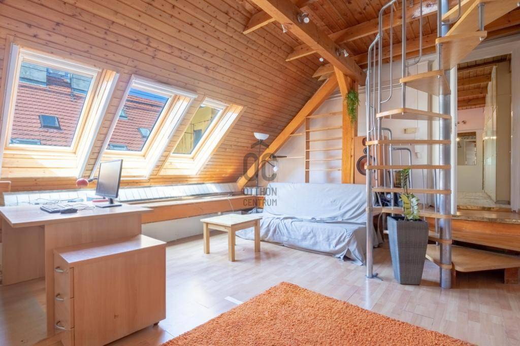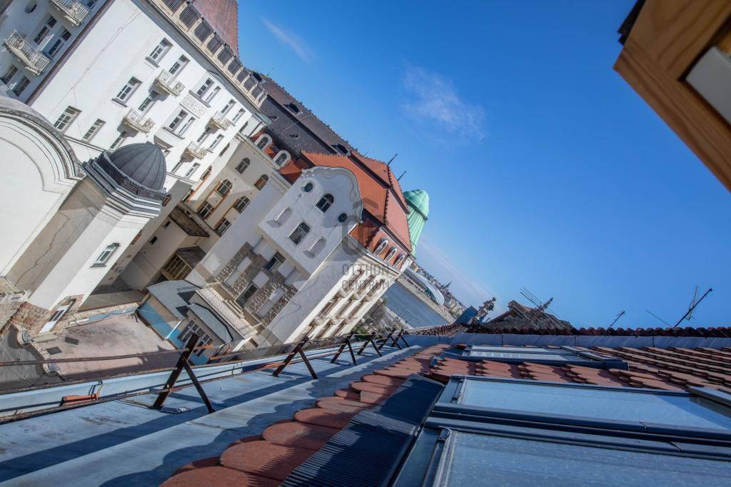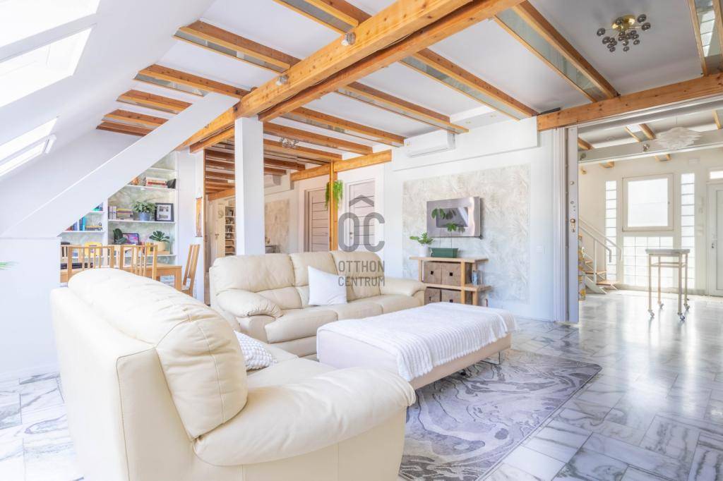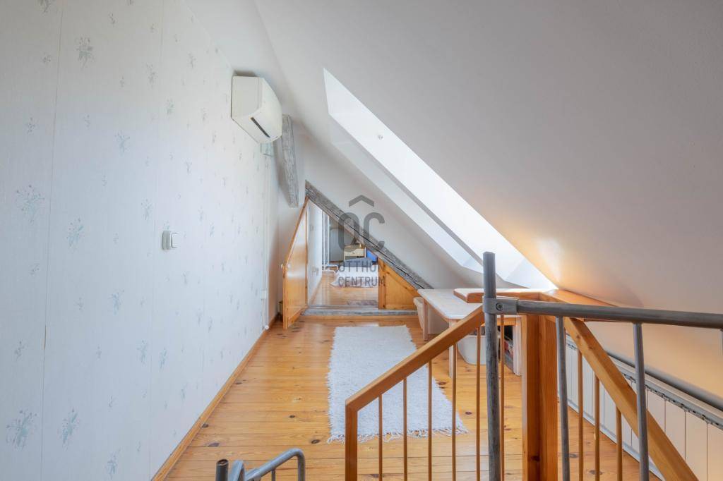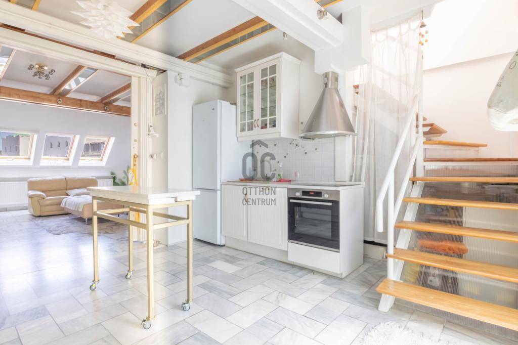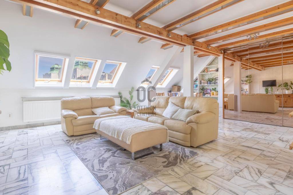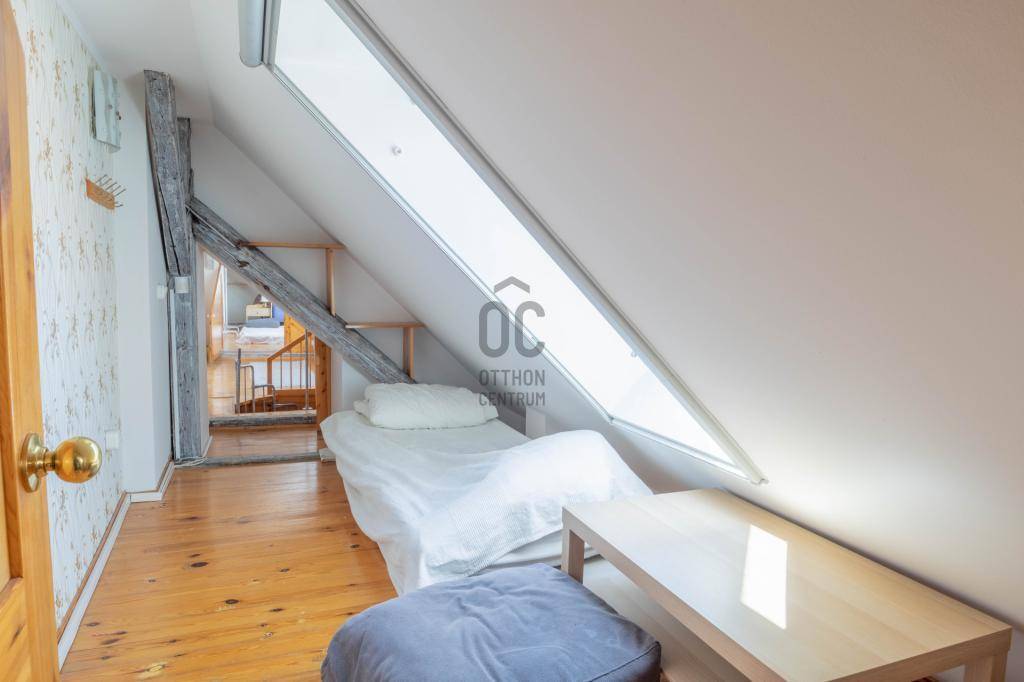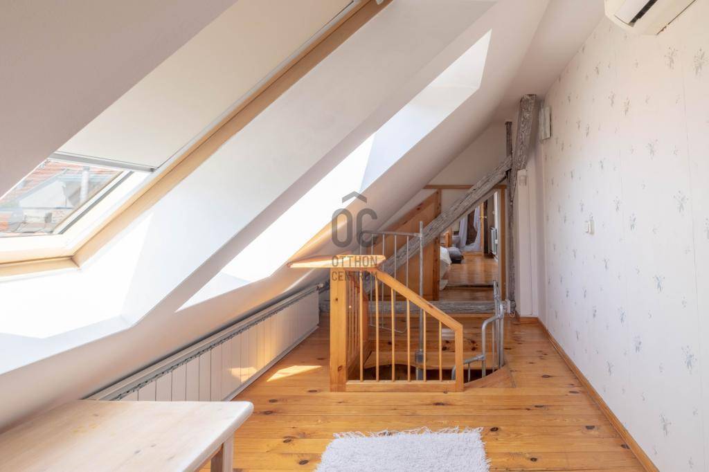 - Tetőtérben helyezkedik el, teljes alapterülete 267 m2, tulajdoni lapon 158 m2-es lakás két lakrészre osztva.
