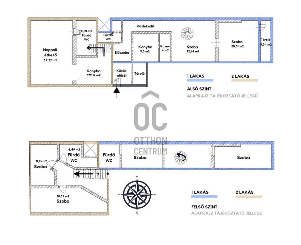 - A két szeparált lakrész közös előszobából nyílik és két nagy, belső két szintes lakásként funkcionál.