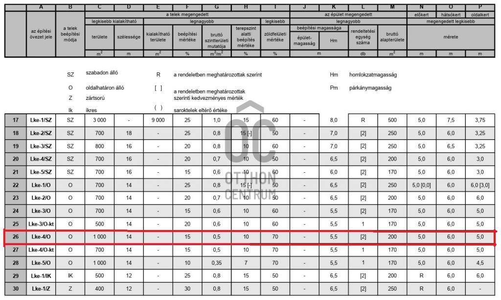- Övezet: Lke-4/O közepesen intenzív, oldalhatáron álló, kistelkes hegyvidéki kertvárosias lakóterület