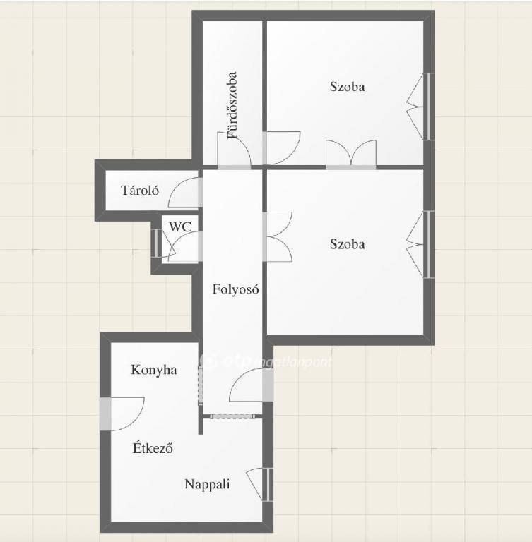 A lakás elrendezése: két tágas szoba, egy nappali és étkező, konyha, fürdőszoba és külön WC - mindez átgondolt, funkcionális térszervezéssel.