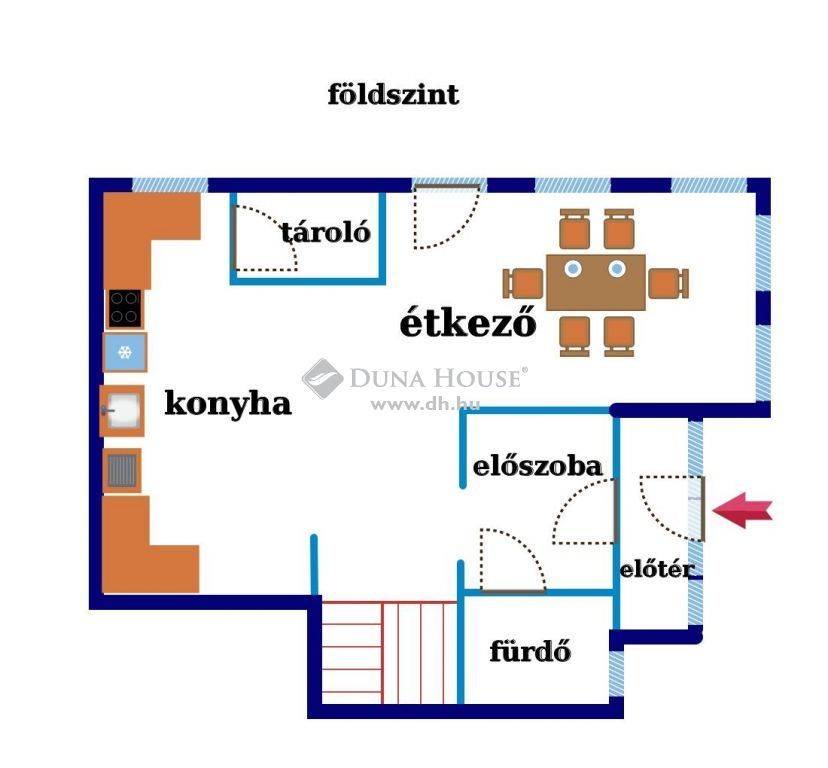 földszinten konyha+ étkező, lépcsőház, előtér, zuhanyzós fürdő + WC, kamra, hátsó terasz