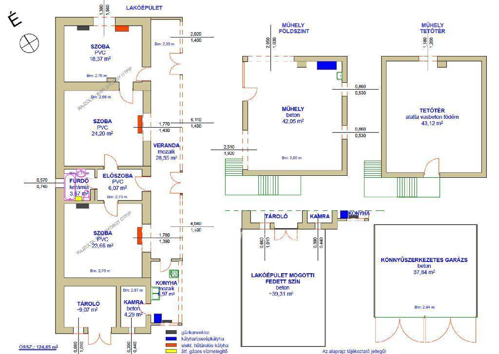 Helyiségek: 3 szoba, veranda, előszoba, fürdő (WC-vel egyben), konyha, kamra, tároló, kétszintes műhelyépület, garázs, fedett szín.
