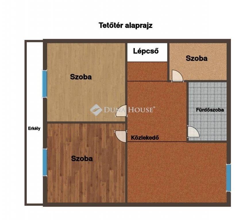 A tetőtérben további három szoba, erkély, közlekedő és fürdőszoba szolgálja a bent lakók kényelmét.