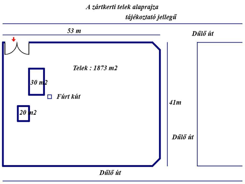 A terület beépítetlen, téglalap alakú, aszfaltozott úttól kb. 150 m-re , családi házak szomszédságában helyezkedik el. A telek domborzata sík, rendezett, jelenleg zöldterület, körben bekerített. Közművek közül a villany a telken belül megtalálható. A gáz és a víz az utcában elérhető. A telken található fúrt kút és kettő beton alap, a nagyobb 30 m2, a kisebb 20 m2 nagyságú. Gépjárművek behajtása dűlő útról, kapubejárón keresztül megoldott.