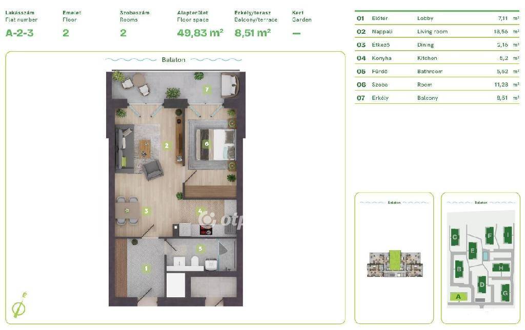 Balaton Déli part, Balatonszemes, közvetlen vízparti, 54 m2 lakás eladó. Az ingatlan a Balaton egyik legszebb vízparti lakóparkjában, természetes zöld környezetben található. A környezettudatosan épült, panorámás kilátást nyújtó, modern épületek esztétikailag és a fenntarthatóság szempontjából is kiemelkedőek, egyszerre biztosítják a kényelmes otthont és a balatoni életstílust. A különböző lakástípusok lehetőséget adnak arra, hogy minden lakó megtalálja a számára tökéletes otthont, akár az Otthon Start Hitelprogram keretében is. A földszinti lakások terasszal és kertkapcsolattal rendelkeznek, az épületek felső emeletén penthouse lakás került kialakításra. Ehhez az 50 m2-es 2. emeleti lakáshoz kis tároló és egy 9 m2-es erkély tartozik. A lakópark nem csak elhelyezkedése miatt egyedi, minden egyes lakás a legújabb intelligens technológiával, magas minőségű és igényes alapanyagokkal, prémium extrákkal kerül kialakításra. Egyszerre komfortosak és energiahatékonyak: elektromos redőnyök, szúnyogháló, egyedileg vezérelhető hőszivattyús, fan-coilos hűtési és fűtési rendszer, okosotthon rendszer, beléptető rendszer, riasztórendszer. Az ingatlan értékét növelik a következő szolgáltatások: a területen kialakított gondnoki, üzemeltetési iroda; zöldterületbe illesztett játszótér; zárt, privát vízpart több, mint 130 méteren; partmenti stég; közel 120 m2 vízfelületű strandmedence 16 m2-es gyermekpancsolóval; automata öntözőhálózat a lakóépületek közötti zöldfelületek öntözésére. OTP Ingatlanpont és Pénzügyi Pont irodánk teljeskörű támogatást nyújt az ingatlan kiválasztásával, megvételével, biztosításával és finanszírozásával, akár egyedi kedvezményes hitelekkel, befektetési lehetőségekkel kapcsolatban is. Bővebb információért keressen telefonon!