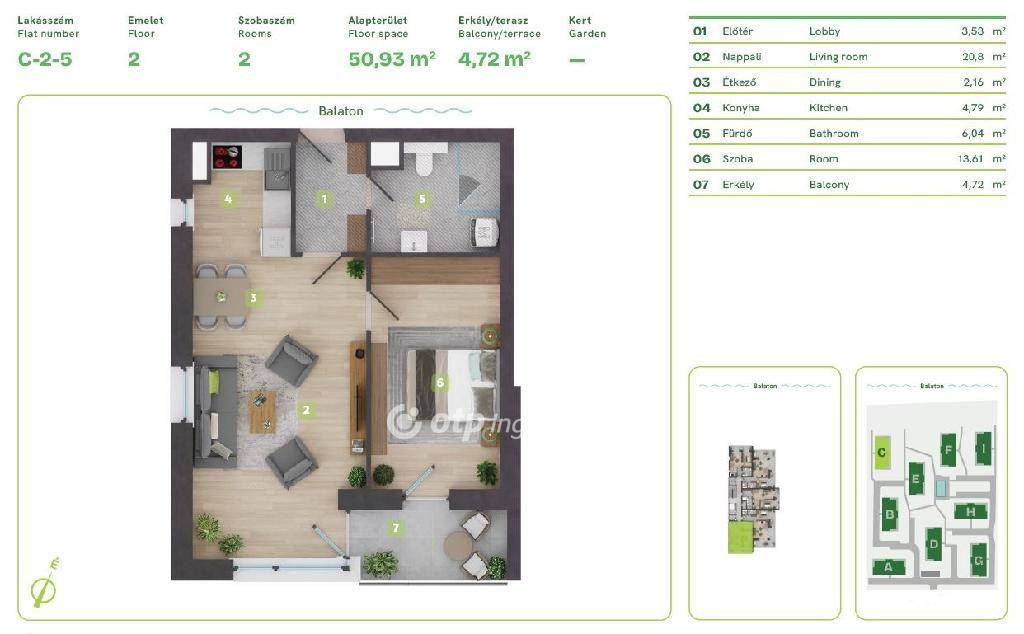 Balaton Déli part, Balatonszemes, közvetlen vízparti, 53 m2 lakás eladó. Az ingatlan a Balaton egyik legszebb vízparti lakóparkjában, természetes zöld környezetben található. A környezettudatosan épült, panorámás kilátást nyújtó, modern épületek esztétikailag és a fenntarthatóság szempontjából is kiemelkedőek, egyszerre biztosítják a kényelmes otthont és a balatoni életstílust. A különböző lakástípusok lehetőséget adnak arra, hogy minden lakó megtalálja a számára tökéletes otthont, akár az Otthon Start Hitelprogram keretében is. A földszinti lakások terasszal és kertkapcsolattal rendelkeznek, az épületek felső emeletén penthouse lakás került kialakításra. Ehhez az 51 m2-es 2. emeleti lakáshoz kis tároló és egy 5 m2-es erkély tartozik. A lakópark nem csak elhelyezkedése miatt egyedi, minden egyes lakás a legújabb intelligens technológiával, magas minőségű és igényes alapanyagokkal, prémium extrákkal kerül kialakításra. Egyszerre komfortosak és energiahatékonyak: elektromos redőnyök, szúnyogháló, egyedileg vezérelhető hőszivattyús, fan-coilos hűtési és fűtési rendszer, okosotthon rendszer, beléptető rendszer, riasztórendszer. Az ingatlan értékét növelik a következő szolgáltatások: a területen kialakított gondnoki, üzemeltetési iroda; zöldterületbe illesztett játszótér; zárt, privát vízpart több, mint 130 méteren; partmenti stég; közel 120 m2 vízfelületű strandmedence 16 m2-es gyermekpancsolóval; automata öntözőhálózat a lakóépületek közötti zöldfelületek öntözésére. OTP Ingatlanpont és Pénzügyi Pont irodánk teljeskörű támogatást nyújt az ingatlan kiválasztásával, megvételével, biztosításával és finanszírozásával, akár egyedi kedvezményes hitelekkel, befektetési lehetőségekkel kapcsolatban is. Bővebb információért keressen telefonon!
