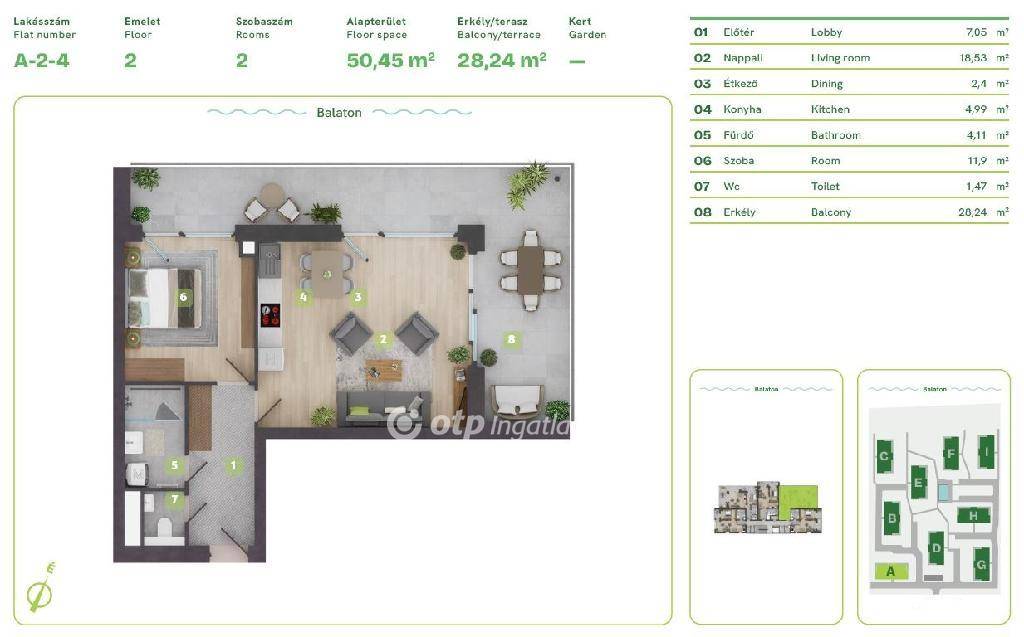 Balaton Déli part, Balatonszemes, közvetlen vízparti, 65 m2 lakás eladó. Az ingatlan a Balaton egyik legszebb vízparti lakóparkjában, természetes zöld környezetben található. A környezettudatosan épült, panorámás kilátást nyújtó, modern épületek esztétikailag és a fenntarthatóság szempontjából is kiemelkedőek, egyszerre biztosítják a kényelmes otthont és a balatoni életstílust. A különböző lakástípusok lehetőséget adnak arra, hogy minden lakó megtalálja a számára tökéletes otthont, akár az Otthon Start Hitelprogram keretében is. A földszinti lakások terasszal és kertkapcsolattal rendelkeznek, az épületek felső emeletén penthouse lakás került kialakításra. Ehhez az 51 m2-es 2. emeleti lakáshoz kis tároló és egy 28 m2-es erkély tartozik. A lakópark nem csak elhelyezkedése miatt egyedi, minden egyes lakás a legújabb intelligens technológiával, magas minőségű és igényes alapanyagokkal, prémium extrákkal kerül kialakításra. Egyszerre komfortosak és energiahatékonyak: elektromos redőnyök, szúnyogháló, egyedileg vezérelhető hőszivattyús, fan-coilos hűtési és fűtési rendszer, okosotthon rendszer, beléptető rendszer, riasztórendszer. Az ingatlan értékét növelik a következő szolgáltatások: a területen kialakított gondnoki, üzemeltetési iroda; zöldterületbe illesztett játszótér; zárt, privát vízpart több, mint 130 méteren; partmenti stég; közel 120 m2 vízfelületű strandmedence 16 m2-es gyermekpancsolóval; automata öntözőhálózat a lakóépületek közötti zöldfelületek öntözésére. OTP Ingatlanpont és Pénzügyi Pont irodánk teljeskörű támogatást nyújt az ingatlan kiválasztásával, megvételével, biztosításával és finanszírozásával, akár egyedi kedvezményes hitelekkel, befektetési lehetőségekkel kapcsolatban is. Bővebb információért keressen telefonon!