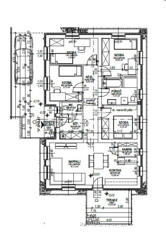 - Külső határoló és főfalak: 30-as N+F tégla falazóelemből készülnek. A belső válaszfalak 10-es N+F tégla falazóelemből készülnek.