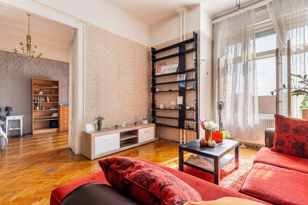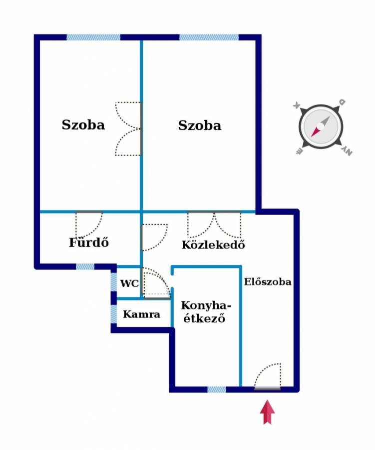 Elrendezése rendkívül praktikus: 2 tágas, utcára néző szoba, ami egymásból és külön is megközelíthető, különnyíló ABLAKOS étkezős konyha, nagyméretű fürdő és külön toalett, kamra, előszoba, közlekedő alkotja.