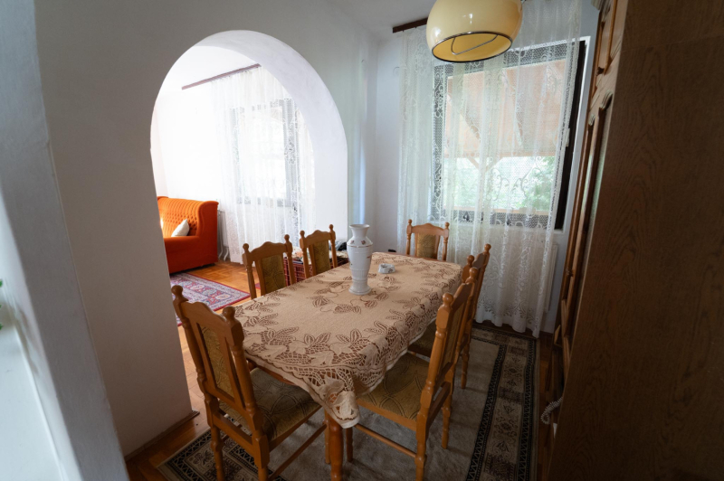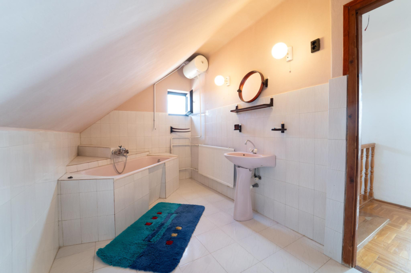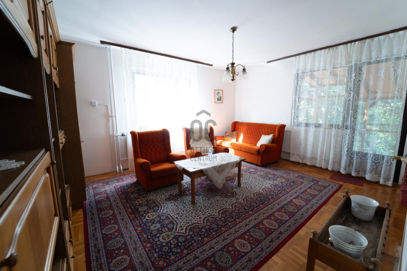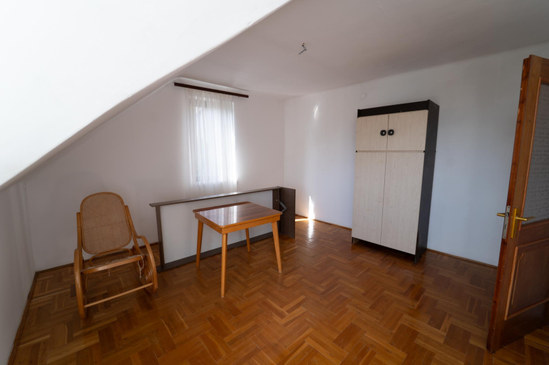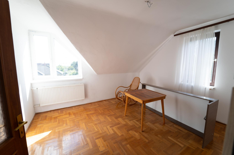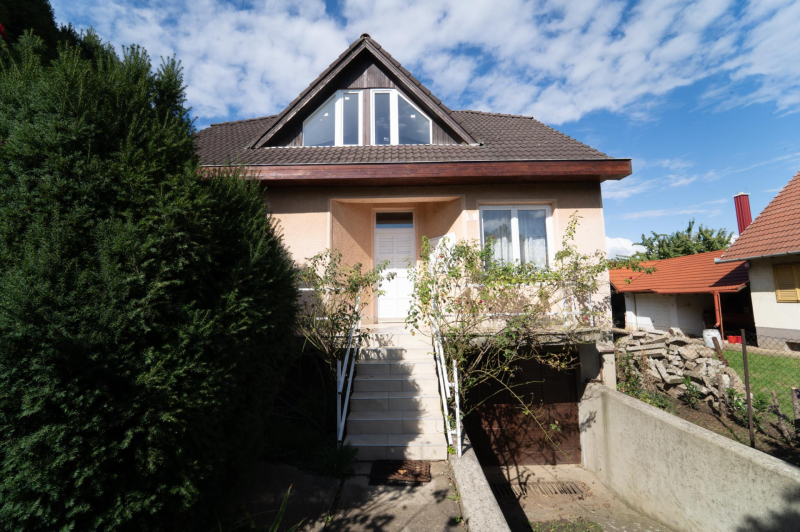 A 90-es évek elején épült, masszív szerkezetű családi ház két lakószinttel és teljesen alápincézett kialakítással rendelkezik. A pince szinten négy helyiség kapott helyet, köztük a garázs és a kazánház, ahol gáz- és vegyes tüzelésű kazán is biztosítja a fűtési lehetőségeket. Az alsó szinten a tágas előszoba után egy impozáns hall fogad, innen nyílik a 30 négyzetméteres nappali, az étkező és a konyha kamrával. Ugyanitt található egy hálószoba, egy fürdőszoba és egy külön wc is. A nappaliból egy 17 négyzetméteres fedett teraszra léphetsz ki, ahonnan a kert nyújt pihentető kilátást. Az emeletre széles falépcső vezet, ahol két nagyobb szoba került kialakításra, valamint egy kényelmes, világos fürdőszoba is szolgálja a család mindennapjait.