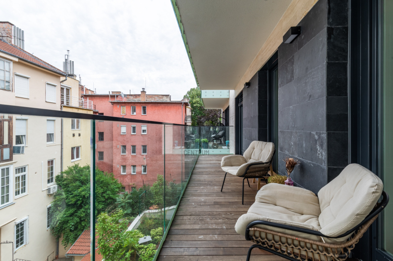 Az igazi életérzés az 11 m²-es erkélyen vár: ide a nappaliból és a hálóból is ki lehet lépni. A belső udvarra nyílik kilátás, ahol egy különleges tetőkert teremt nyugodt, szinte mediterrán hangulatot. Ez az a fajta otthon, ahol reggel jólesik kiülni egy kávéval, este pedig élvezni a város fölött elterülő csendet.