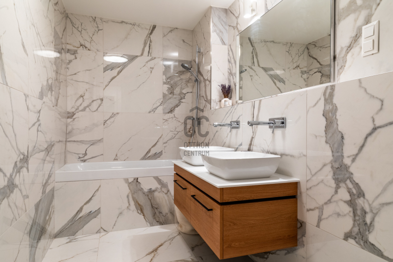 A fürdőszoba felszereltsége szintén prémium színvonalú: Grohe okos WC, valamint Villeroy & Boch szaniterek emelik a mindennapi használat élményét.