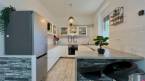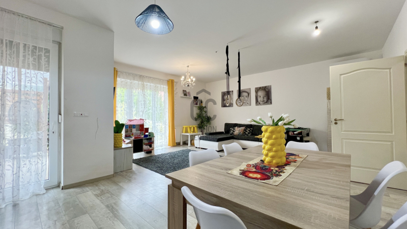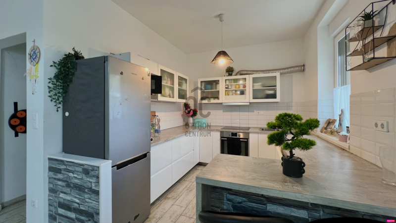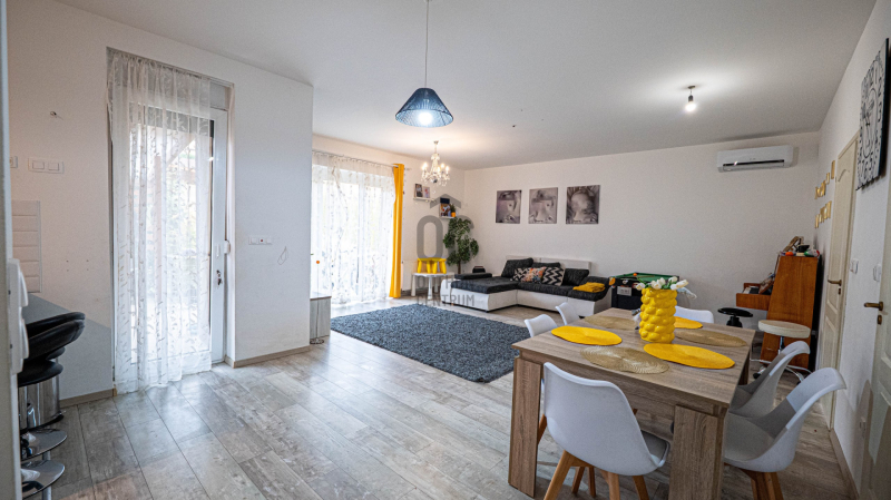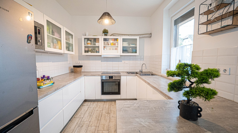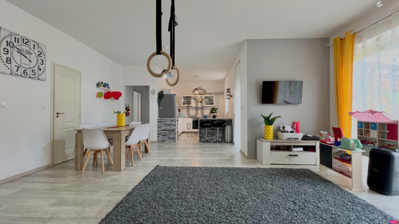 A nagyméretű nappali-étkező a konyhával egy légtérben van, így a ház asszonya is könnyedén tud kapcsolódni a család többi tagjával főzés közben is.
