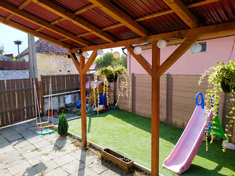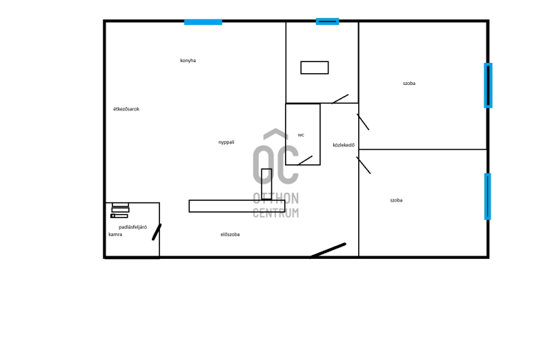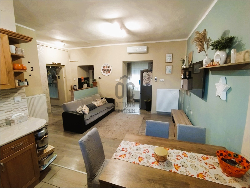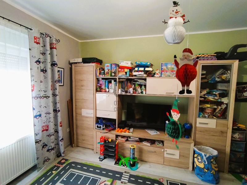 Helyiségek: Jól szeparált, de egy légterű az előszoba, nappali/konya/étkező, közlekedő. Két tágas hálószoba, fürdő, WC, tárolóként is funkcionáló padlásfeljáró a többi helyiségek. A bejárat előtt 8 m2-es fedett terasz.