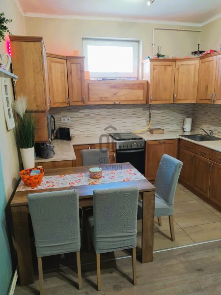 Borovi fenyőből, méretre készült a konyhabútor, beépített mosogatógéppel, gáztűzhellyel. Külön van a fürdő és a toalett.