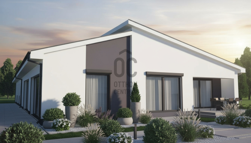 A lakóház minden elemében a korszerű, energiatudatos építészet értékeit képviseli. Kifinomult, időtálló megjelenést kapott prémium szilikonos nemesvakolattal, letisztult homlokzatburkolatokkal és nagyvonalú üvegfelületekkel. A világos, napfényes nappali, étkező és konyha egységből közvetlen kapcsolat nyílik a teraszra és a parkosított, térköves udvarra, ahol az automata öntözőrendszer előkészítés is megtalálható. Esztétikus, világos térkő burkolat az udvaron, parkosított zöldterület, automata öntözőrendszer előkészítés, dísznövények, elkerített telek elektromos kapuval.