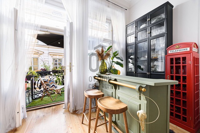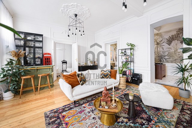 A lakás Budapest történelmi belvárosának egyik legszebb macskaköves utcájában található, egy 130 éves műemlékvédelem alatt álló ház második emeletén.