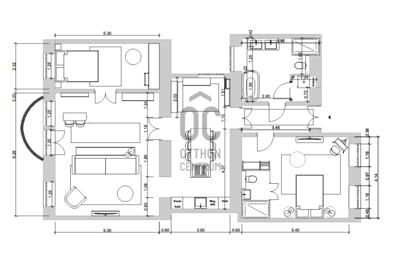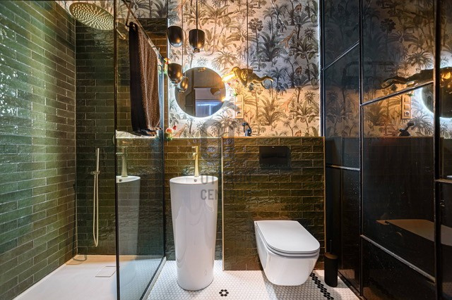 Két külön fürdőszoba került kialakításra, a kisebb közvetlen hálószoba kapcsolattal rendelkezik. A nagyobbik fürdőszoba az otthoni wellness szerepét tölti be, tágas méretei, a szabadon álló fürdőkád, és az egyedi épített zuhanyzó a relaxációnak ad teret. Itt található egy külön háztartási helyiség is, ahol helyt kapott a mosógép és egy plusz bojler gondoskodik a kifogyhatatlan meleg víz ellátásról.