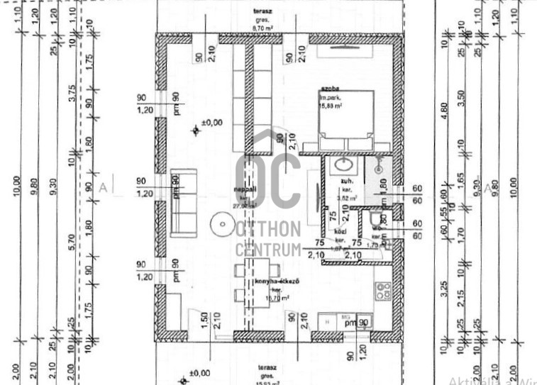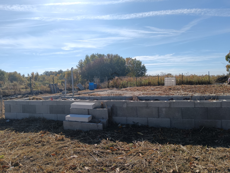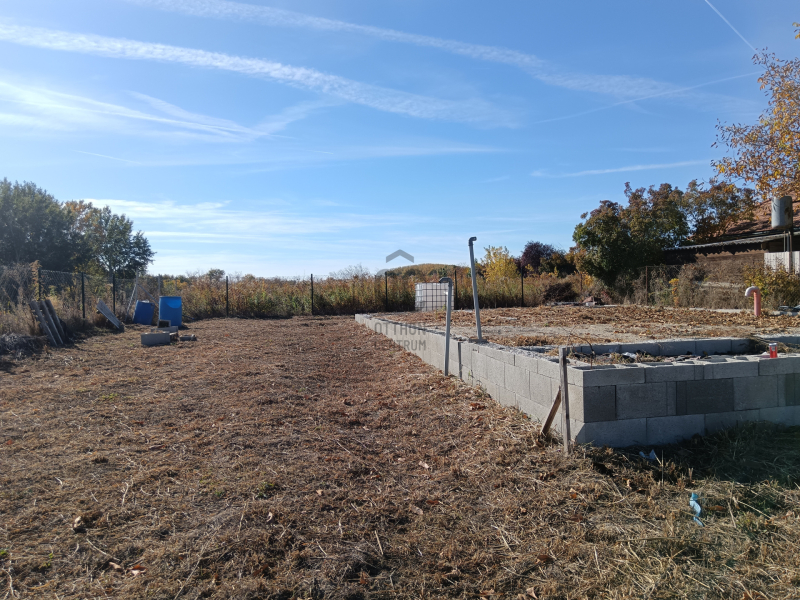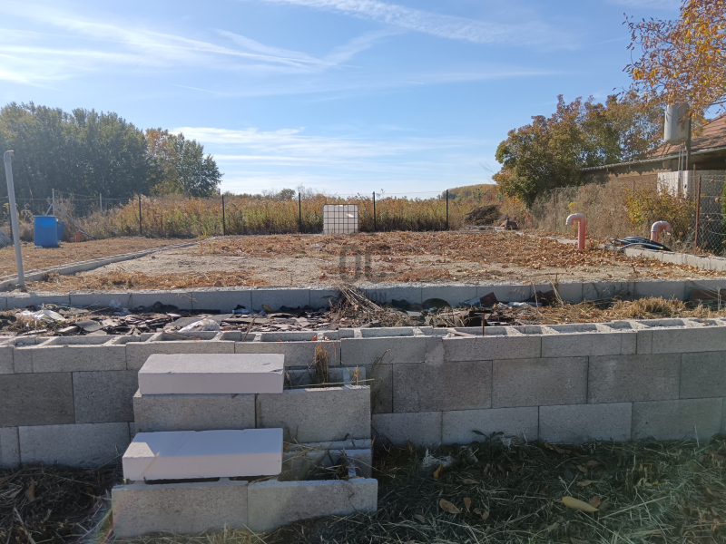 A telken egy br. 90 m2-es, nettó 66 m2-es amerikai nappali-konyhás, egy hálószobás, fürdős nyaralóház alapjai találhatóak.