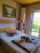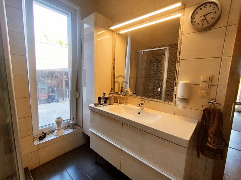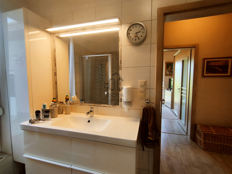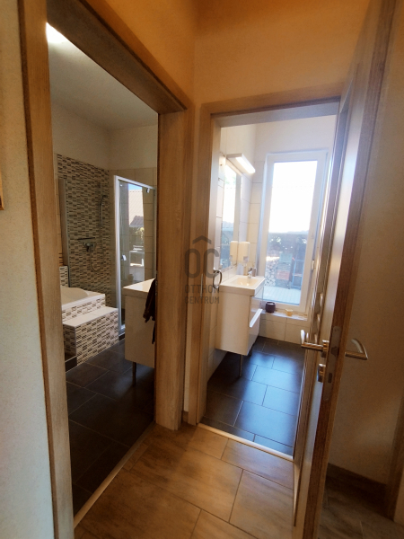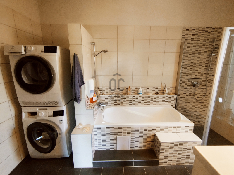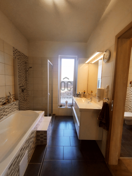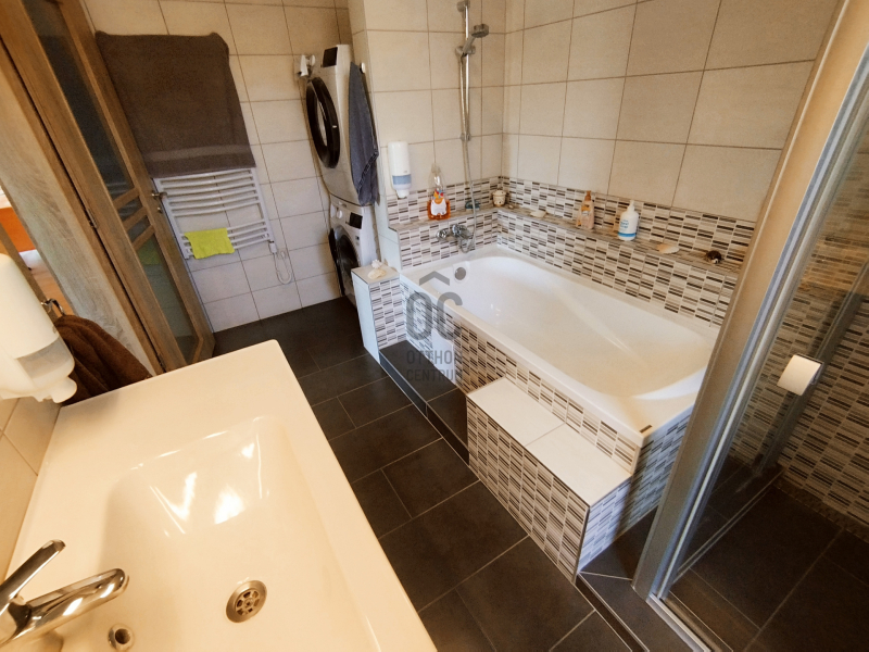 A zuhanykabinnal és káddal rendelkező fürdőszoba mellett közvetlenül egy WC helyiség kézmosóval is kialakításra került.