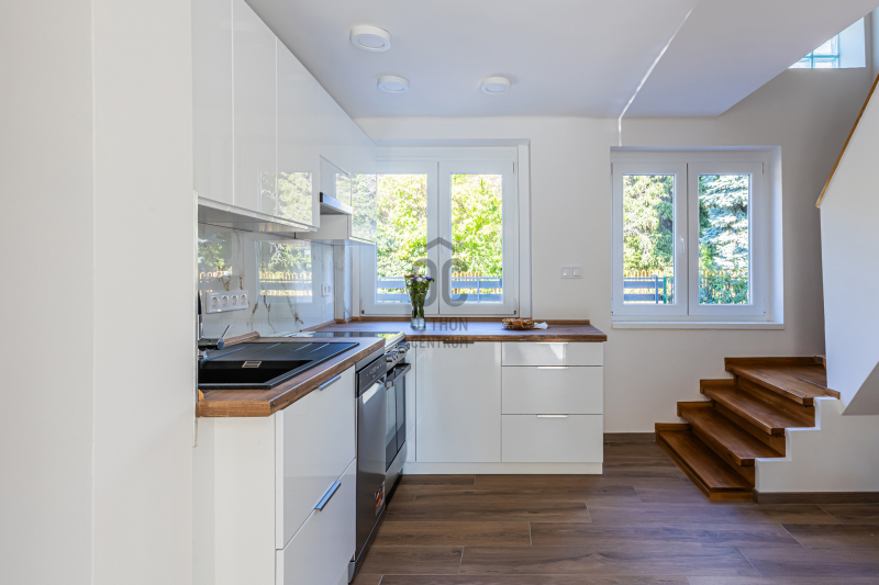 A konyhában új beépített bútorok mellett első osztályú tűzhely , mosogatógép lett beépítve.