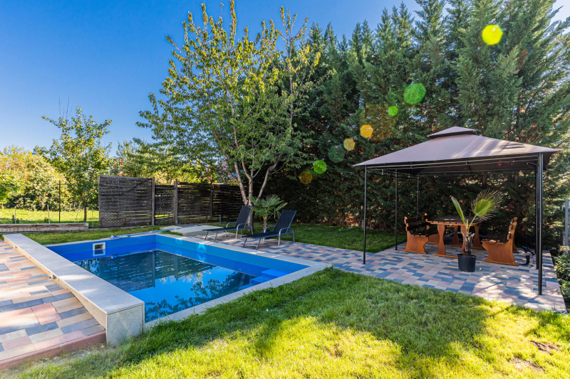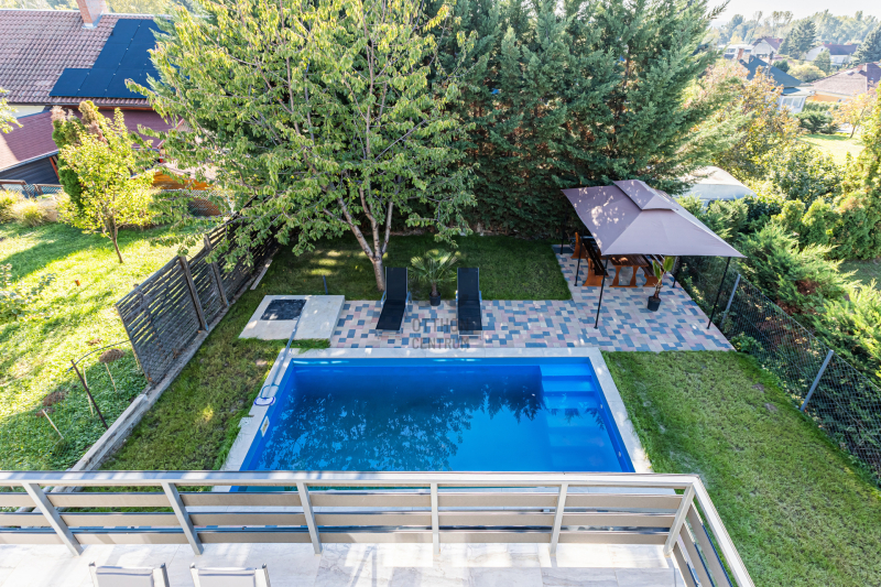 A rendezett kert és a medencés ház környezete ideális a szabadidő eltöltésére, legyen szó baráti összejövetelekről vagy családi programokról.