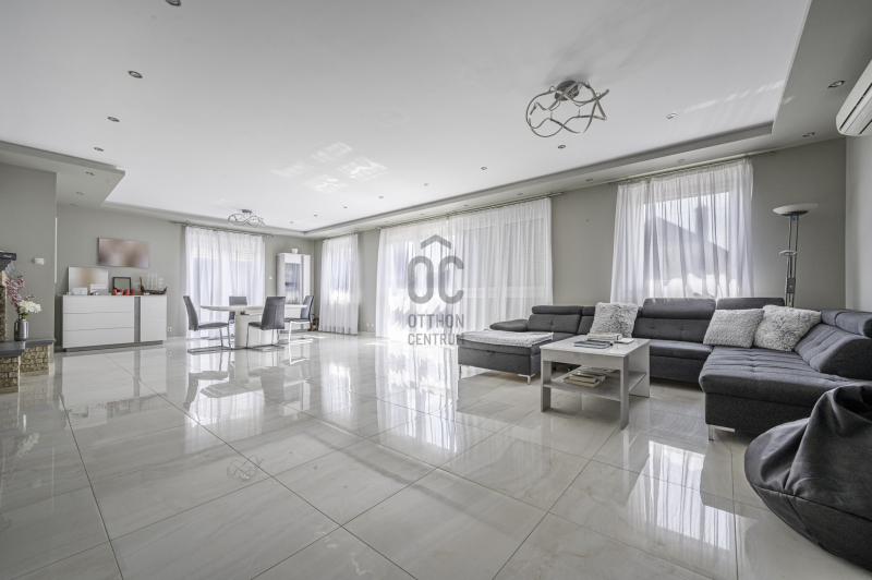 Az ingatlant tágas és világos terek jellemzik, az alsó szinten levő nappali bárpulttal, és a földszinten levő nappali, egyaránt 60-60 m2, és déli fekvésűek. Minden szinten, beépített hatalmas tükrös szekrények. Fedett gépkocsi tároló, 3 autó részére. A közeli Halmi erdőbe, mely 5 perc kényelmes sétára található, kiváló sportolásra és kikapcsolódásra, ad lehetőséget.