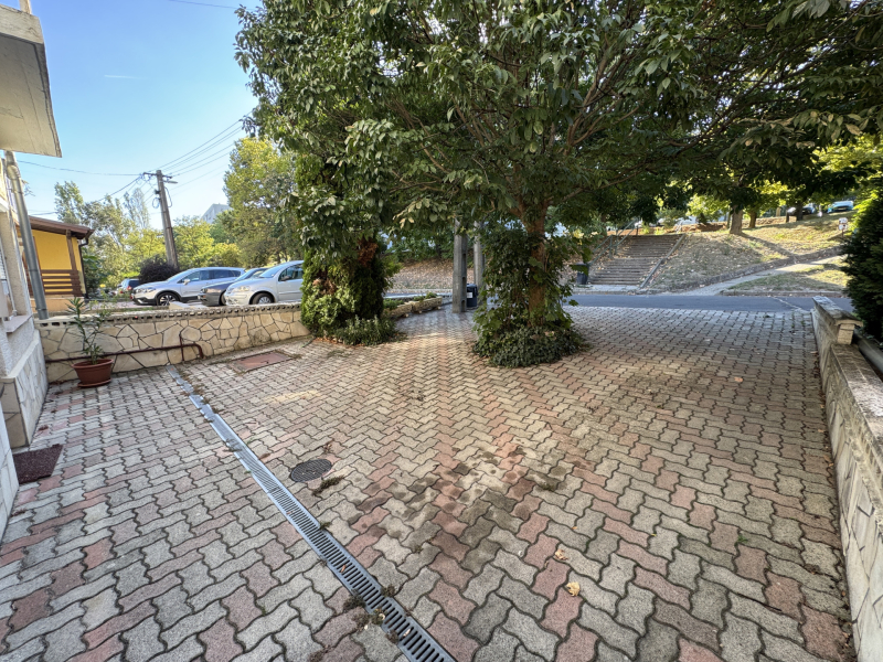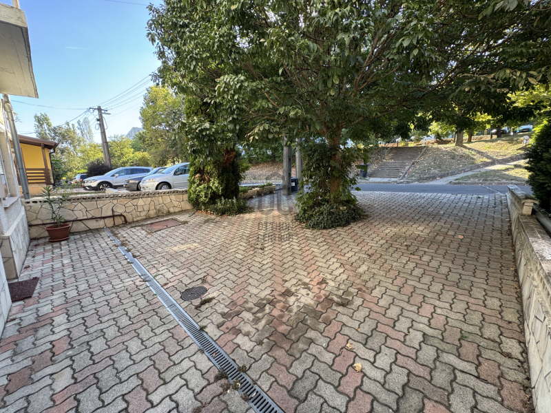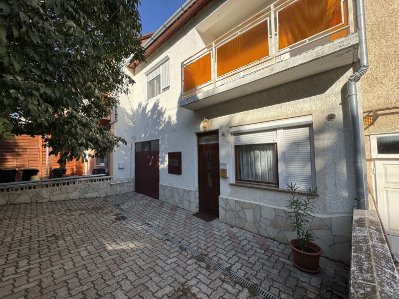 Ezen kívül a ház felújítandó állapotban van. Külseje nagyon megnyerő, 3 lakószinttel rendelkezik a tájékoztató jellegű alaprajzon látható elosztásban. A Szekszárdon megszokott sorházaktól megkülönbözteti az első emeleti tetőterasza és \\\"kivett lakóház, udvar\\\"-ként való bejegyzése, ami nem gördít akadályt a hitelfelvétel útjába. Az alagsorból elérhető egy hátsó kert rész, ahol füvesített udvar és kis lankás részen szőlő található.