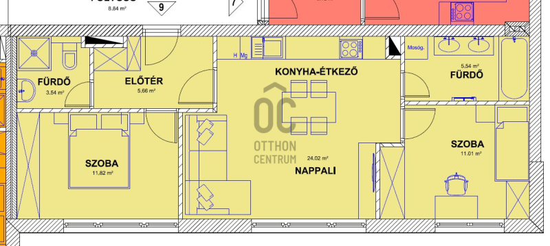 A társasház emeletén található, 62 m²-es lakás két külön nyíló szobával, tágas nappali-konyha-étkezővel és előtérrel rendelkezik, így minden nap kényelmesen telhet. A fürdőszobák praktikus kialakításúak: a kisebbik zuhanyzóval és WC-vel, a nagyobbik káddal felszerelt.