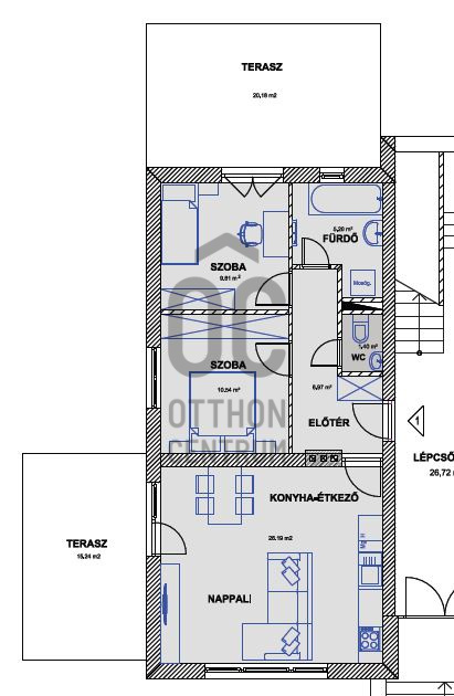 A 60 m²-es lakás kialakítása két szobát, egy nappali–konyha–étkező részt, előteret, kádas fürdőszobát és külön WC-t foglal magában. A belső burkolatok megújulnak: a szobákban laminált padló, míg az előtérben és a vizesblokkokban járólap kerül elhelyezésre. A lakáshoz két kertkapcsolatos terasz tartozik – az egyik 15,24 m²-es, a nappali–konyha–étkezőből nyílik, a másik pedig 20,18 m²-es, és a szobából közelíthető meg – így a szabadtéri pihenés egész évben adott lesz.