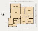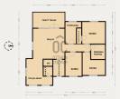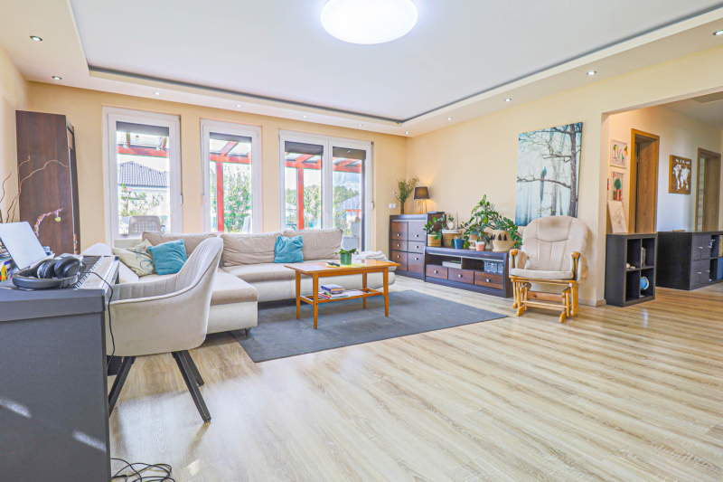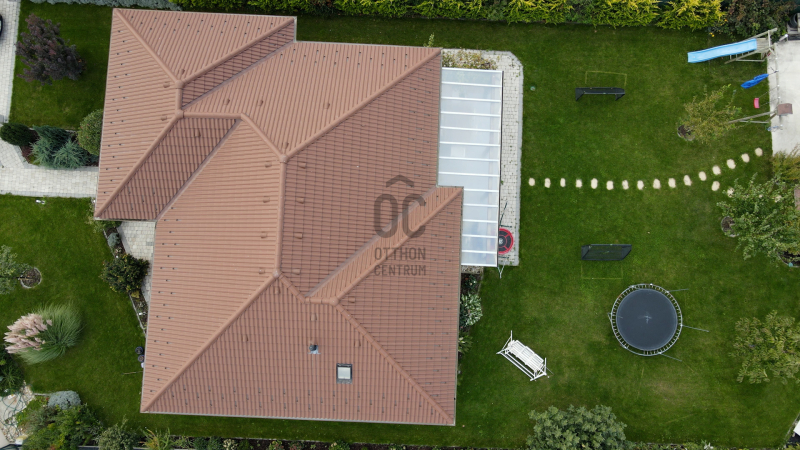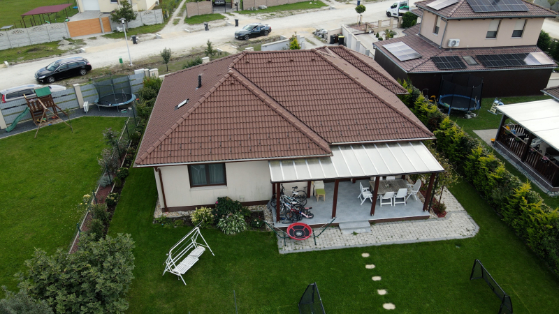 tágas, amerikai konyhás nappali, közvetlen kijárattal a 15 m²-es fedett teraszra, klíma előkészítéssel