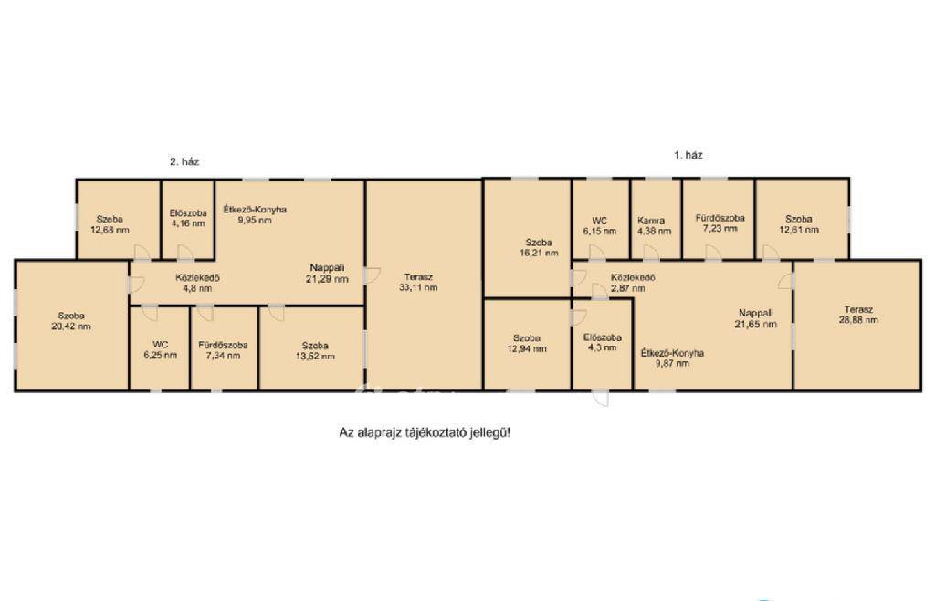 nappali, konyha- étkező, gépészeti helyiség, közlekedő, előszoba, 3 külön nyíló szoba, 2 fürdőszoba WC-vel egy helyiségben, és terasz.