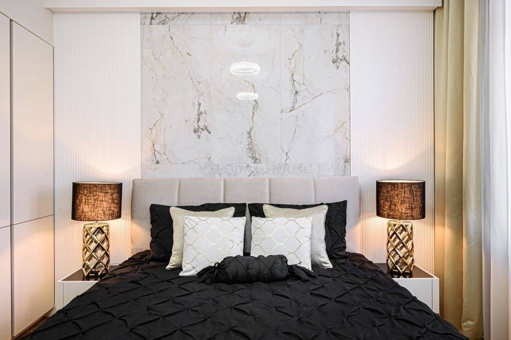 The decorative walls of the bedrooms are covered with stone and slats, the exclusive, beautiful surfaces of which give the space a unique and special effect. The beds were given custom-designed upholstery headboards, behind which individually designed lighting technology was installed to make the bedrooms even more cozy.