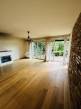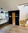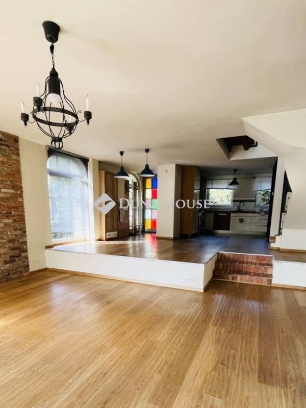 Az alsó szinten az előtér és egy kis mosdóhelyiség mellett a teraszkapcsolatos, tágas (40 m2), süllyesztett nappali kapott helyet, mely a kandallónak, a nagy üvegfelületnek köszönhetően világos, barátságos.