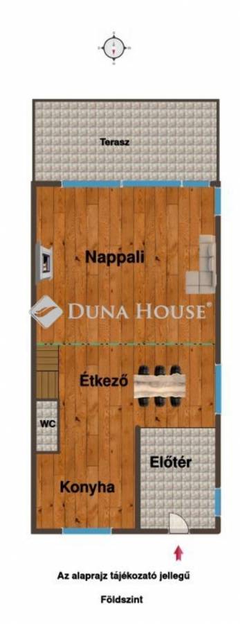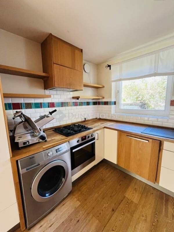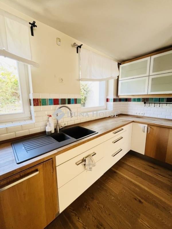 A nappalitól elszeparáltan, pár lépcsőfokkal magasabban található a modern, konyhagépekkel felszerelt konyha.