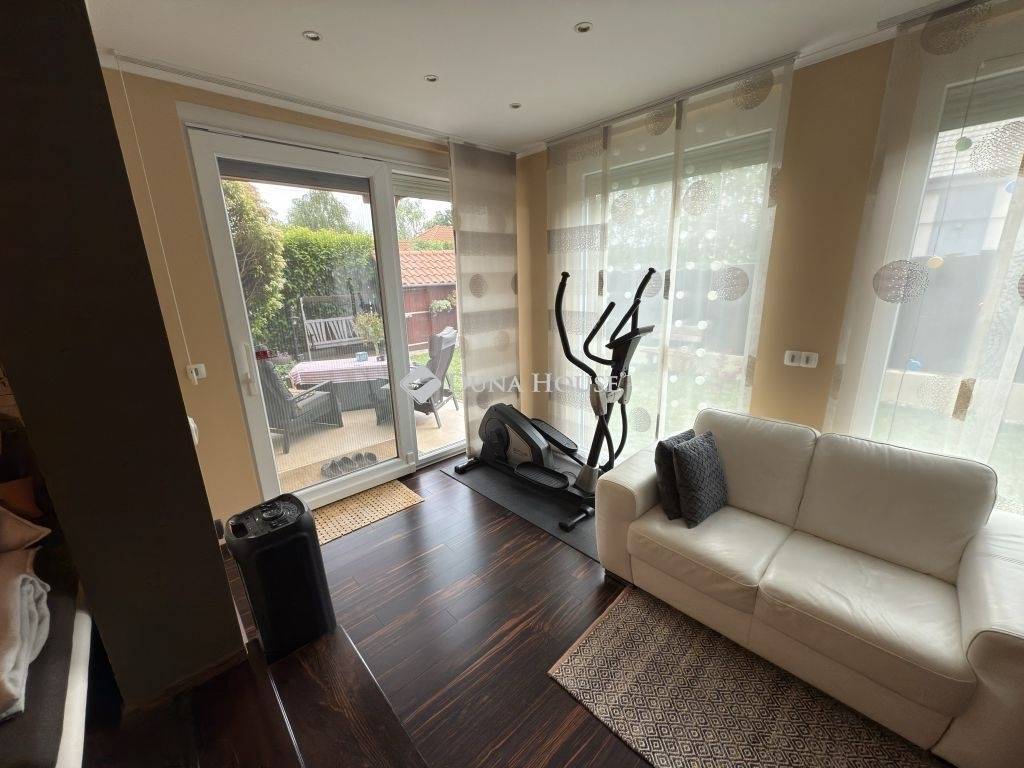 Az ingatlan egy belső kétszintes, összesen 142 m² alapterületű családi ház, amelyet praktikus elosztás, tágas terek és otthonos hangulat jellemez. Az alsó szinten egy világos, nagy nappali, konyha-étkező, fürdőszoba és egy hálószoba található, míg az emeleten további három külön nyíló hálószoba és egy második fürdőszoba kapott helyet, így az otthon duplakomfortos kialakítású.