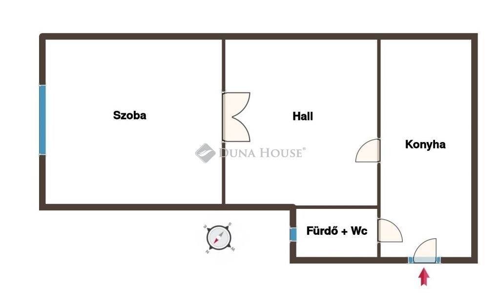 Az ingatlanban egy tágas szoba, egy szobaként, nappaliként is hasznosítható hall, egy tágas konyha, továbbá egy ablakkal is szellőztethető fürdőszoba+wc helyiségek találhatóak. Elrendezése okán fiatalok, párok, idősek, esetleg kisebb család számára ideális választás.