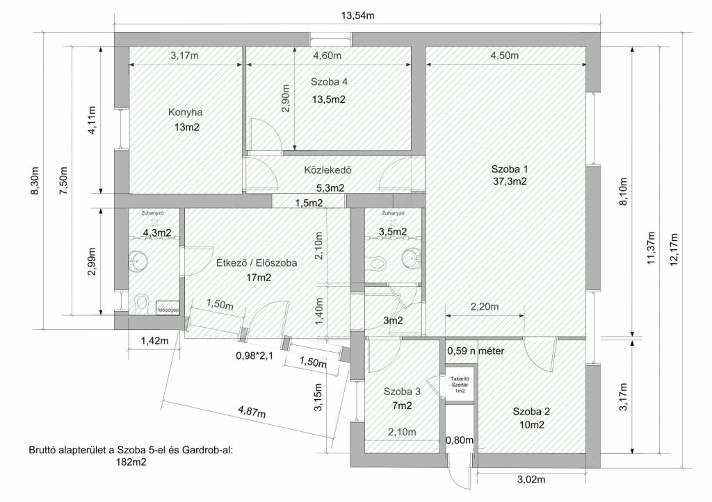 Három nagyszoba (37+13+18 nm), valamint két félszoba (10+7 nm). Konyha, nappali étkező, valamint kettő fürdőszoba, gardrób és előszobák tartoznak a házhoz. A fűtést és a meleg vizet is korszerű kondenzációs gázkazán adja, éves fogyasztás 1400 m3. A ház teljes közművel rendelkezik. Légkondicionáló beszerelve, vízlágyító berendezés be lett építve. Gondozott kert, ásott kút. A ház alatt kb. 10 nm pince.
