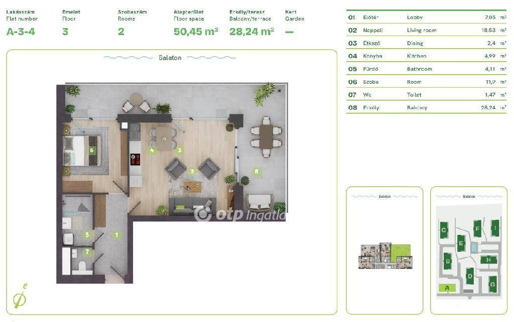 Balaton Déli part, Balatonszemes, közvetlen vízparti, 65 m2 lakás eladó. Az ingatlan a Balaton egyik legszebb vízparti lakóparkjában, természetes zöld környezetben található. A környezettudatosan épült, panorámás kilátást nyújtó, modern épületek esztétikailag és a fenntarthatóság szempontjából is kiemelkedőek, egyszerre biztosítják a kényelmes otthont és a balatoni életstílust. A különböző lakástípusok lehetőséget adnak arra, hogy minden lakó megtalálja a számára tökéletes otthont, akár az Otthon Start Hitelprogram keretében is. A földszinti lakások terasszal és kertkapcsolattal rendelkeznek, az épületek felső emeletén penthouse lakás került kialakításra. Ehhez az 51 m2-es 3. emeleti lakáshoz kis tároló és egy 28 m2-es erkély tartozik. A lakópark nem csak elhelyezkedése miatt egyedi, minden egyes lakás a legújabb intelligens technológiával, magas minőségű és igényes alapanyagokkal, prémium extrákkal kerül kialakításra. Egyszerre komfortosak és energiahatékonyak: elektromos redőnyök, szúnyogháló, egyedileg vezérelhető hőszivattyús, fan-coilos hűtési és fűtési rendszer, okosotthon rendszer, beléptető rendszer, riasztórendszer. Az ingatlan értékét növelik a következő szolgáltatások: a területen kialakított gondnoki, üzemeltetési iroda; zöldterületbe illesztett játszótér; zárt, privát vízpart több, mint 130 méteren; partmenti stég; közel 120 m2 vízfelületű strandmedence 16 m2-es gyermekpancsolóval; automata öntözőhálózat a lakóépületek közötti zöldfelületek öntözésére. OTP Ingatlanpont és Pénzügyi Pont irodánk teljeskörű támogatást nyújt az ingatlan kiválasztásával, megvételével, biztosításával és finanszírozásával, akár egyedi kedvezményes hitelekkel, befektetési lehetőségekkel kapcsolatban is. Bővebb információért keressen telefonon!