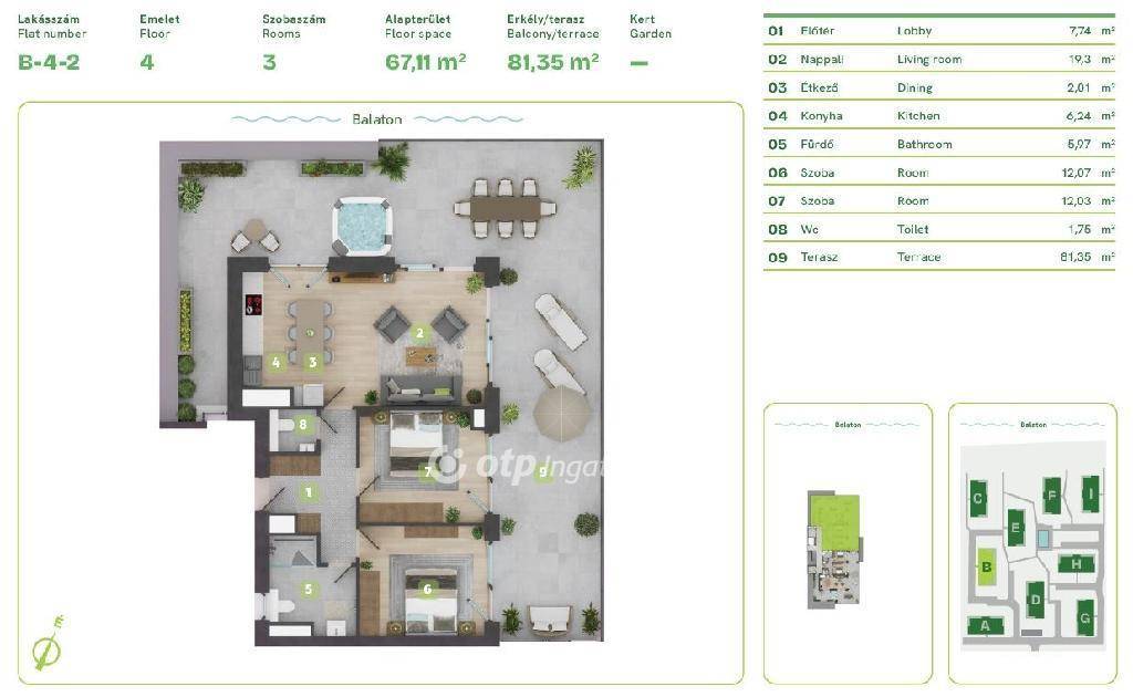 Balaton Déli part, Balatonszemes, közvetlen vízparti, 108 m2 panorámás penthouse lakás eladó. Az ingatlan a Balaton egyik legszebb vízparti lakóparkjában, természetes zöld környezetben található. A környezettudatosan épült, panorámás kilátást nyújtó, modern épületek esztétikailag és a fenntarthatóság szempontjából is kiemelkedőek, egyszerre biztosítják a kényelmes otthont és a balatoni életstílust. A különböző lakástípusok lehetőséget adnak arra, hogy minden lakó megtalálja a számára tökéletes otthont, akár az Otthon Start Hitelprogram keretében is. A földszinti lakások terasszal és kertkapcsolattal rendelkeznek, az épületek felső emeletén penthouse lakás került kialakításra. Ehhez a 67 m2-es, balatoni panorámás 4. emeleti lakáshoz kis tároló és egy 81 m2-es tetőterasz tartozik. A lakópark nem csak elhelyezkedése miatt egyedi, minden egyes lakás a legújabb intelligens technológiával, magas minőségű és igényes alapanyagokkal, prémium extrákkal kerül kialakításra. Egyszerre komfortosak és energiahatékonyak: elektromos redőnyök, szúnyogháló, egyedileg vezérelhető hőszivattyús, fan-coilos hűtési és fűtési rendszer, okosotthon rendszer, beléptető rendszer, riasztórendszer. Az ingatlan értékét növelik a következő szolgáltatások: a területen kialakított gondnoki, üzemeltetési iroda; zöldterületbe illesztett játszótér; zárt, privát vízpart több, mint 130 méteren; partmenti stég; közel 120 m2 vízfelületű strandmedence 16 m2-es gyermekpancsolóval; automata öntözőhálózat a lakóépületek közötti zöldfelületek öntözésére. OTP Ingatlanpont és Pénzügyi Pont irodánk teljeskörű támogatást nyújt az ingatlan kiválasztásával, megvételével, biztosításával és finanszírozásával, akár egyedi kedvezményes hitelekkel, befektetési lehetőségekkel kapcsolatban is. Bővebb információért keressen telefonon