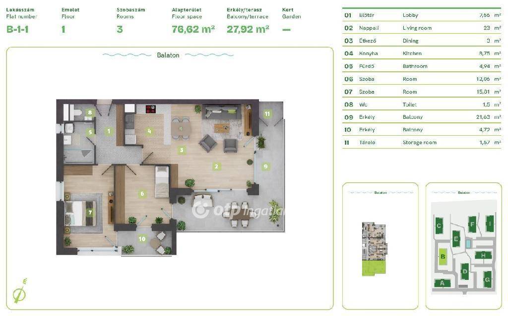 Balaton Déli part, Balatonszemes, közvetlen vízparti, 90 m2 lakás eladó. Az ingatlan a Balaton egyik legszebb vízparti lakóparkjában, természetes zöld környezetben található. A környezettudatosan épült, panorámás kilátást nyújtó, modern épületek esztétikailag és a fenntarthatóság szempontjából is kiemelkedőek, egyszerre biztosítják a kényelmes otthont és a balatoni életstílust. A különböző lakástípusok lehetőséget adnak arra, hogy minden lakó megtalálja a számára tökéletes otthont, akár az Otthon Start Hitelprogram keretében is. A földszinti lakások terasszal és kertkapcsolattal rendelkeznek, az épületek felső emeletén penthouse lakás került kialakításra. Ehhez a 77 m2-es 1. emeleti lakáshoz kis tároló és két, összesen 26 m2 erkély tartozik. A lakópark nem csak elhelyezkedése miatt egyedi, minden egyes lakás a legújabb intelligens technológiával, magas minőségű és igényes alapanyagokkal, prémium extrákkal kerül kialakításra. Egyszerre komfortosak és energiahatékonyak: elektromos redőnyök, szúnyogháló, egyedileg vezérelhető hőszivattyús, fan-coilos hűtési és fűtési rendszer, okosotthon rendszer, beléptető rendszer, riasztórendszer. Az ingatlan értékét növelik a következő szolgáltatások: a területen kialakított gondnoki, üzemeltetési iroda; zöldterületbe illesztett játszótér; zárt, privát vízpart több, mint 130 méteren; partmenti stég; közel 120 m2 vízfelületű strandmedence 16 m2-es gyermekpancsolóval; automata öntözőhálózat a lakóépületek közötti zöldfelületek öntözésére. OTP Ingatlanpont és Pénzügyi Pont irodánk teljeskörű támogatást nyújt az ingatlan kiválasztásával, megvételével, biztosításával és finanszírozásával, akár egyedi kedvezményes hitelekkel, befektetési lehetőségekkel kapcsolatban is. Bővebb információért keressen telefonon!
