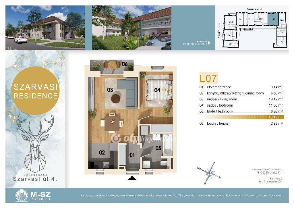 AZ EMELETI ALAPRAJZON LÁTHATÓ L07 JELÖLÉSŰ 49 m2 ALAPTERÜLETŰ LAKÁS, előtér (3,00 m2), konyha-étkező (5,60 m2), nappali (19,00 m2), szoba (11,70 m2), kádas fürdőszoba wc-vel (6,90 m2), loggia (2,90 m2) kialakítású. A nappali és szoba laminált parketta, a többi helyiség kőporcelán padlólap burkolatú. A fűtés levegő-víz hőszivattyús rendszerű padlófűtés, a fürdőszobában törülközőszárító radiátor. A hűtés levegő-levegő hőszivattyús rendszerű, magas oldalfali beltéri egységgel.