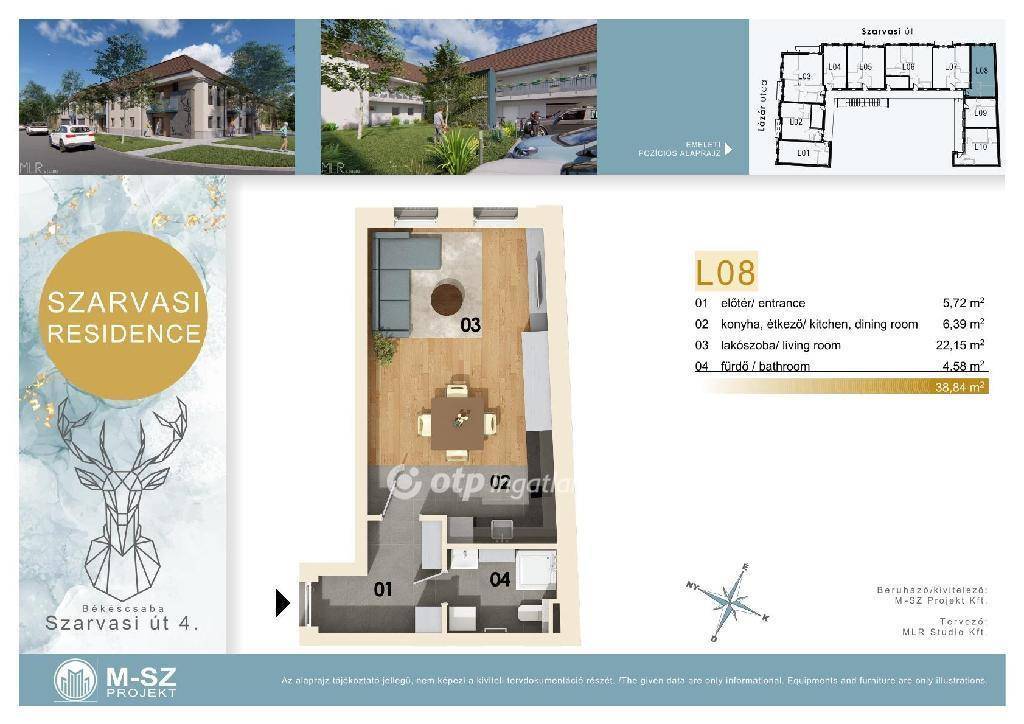 AZ EMELETI ALAPRAJZON LÁTHATÓ L08 JELÖLÉSŰ 39 m2 ALAPTERÜLETŰ LAKÁS, előtér (5,70 m2), konyha-étkező (6,40 m2), lakószoba (22,00 m2), épített zuhanyzós fürdőszoba wc-vel (4,50 m2) kialakítású. A szoba laminált parketta, a többi helyiség kőporcelán padlólap burkolatú. A szobában a fűtés (hűtés) levegő-levegő hőszivattyús rendszerű, a fürdőszobában törülközőszárító radiátor.