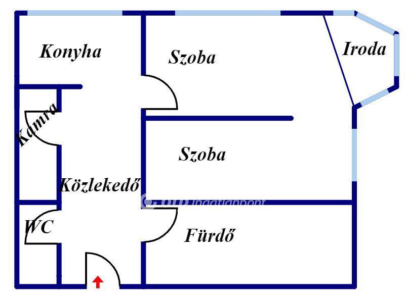 Nappali, hálószoba, irodahelyiség, konyha, előtér, fürdő, wc helyiségekkel rendelkezik.