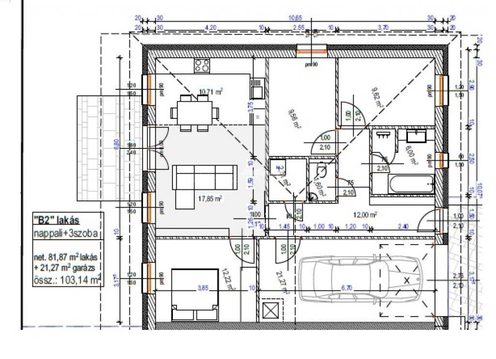 - gépkocsi beálló, garázs (garázskapu szekcionált motoros kivitel), vagy (garázs helyett szoba) variálható, és nyitott feljáró a garázs előtt