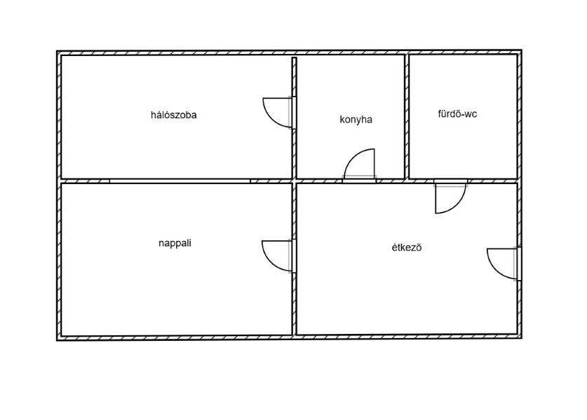 Elosztás: Nappali, hálószoba, étkező, konyha és fürdő-WC. A hálószoba és a nappali tolóajtóval választható el, ami modern és helytakarékos megoldás.