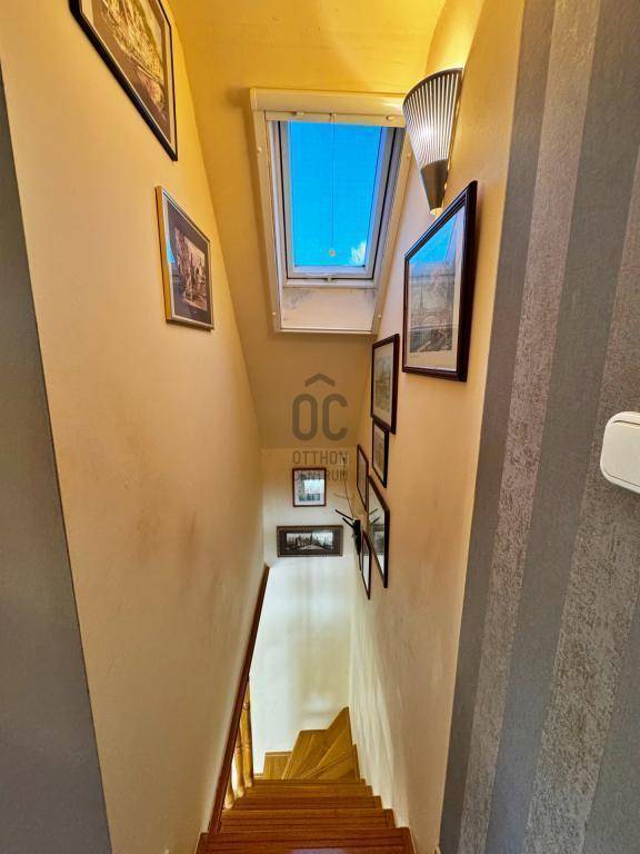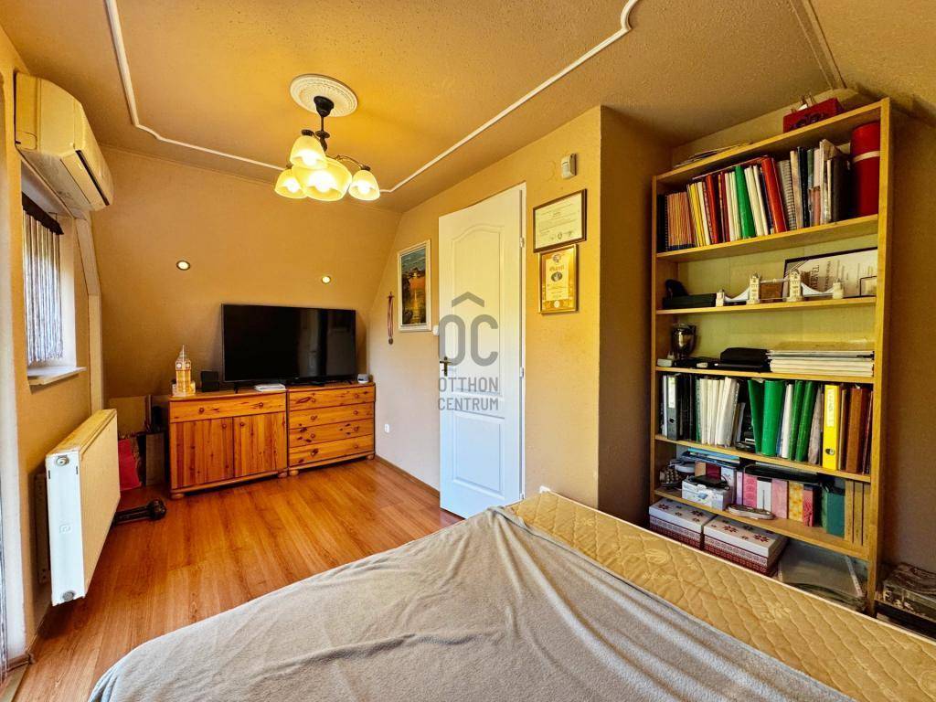Az emelet elosztása két szoba, ez egyikből kilátással a Dunára, a másik szobából kilátás a mezőre és az erdőre, WC és közlekedő.