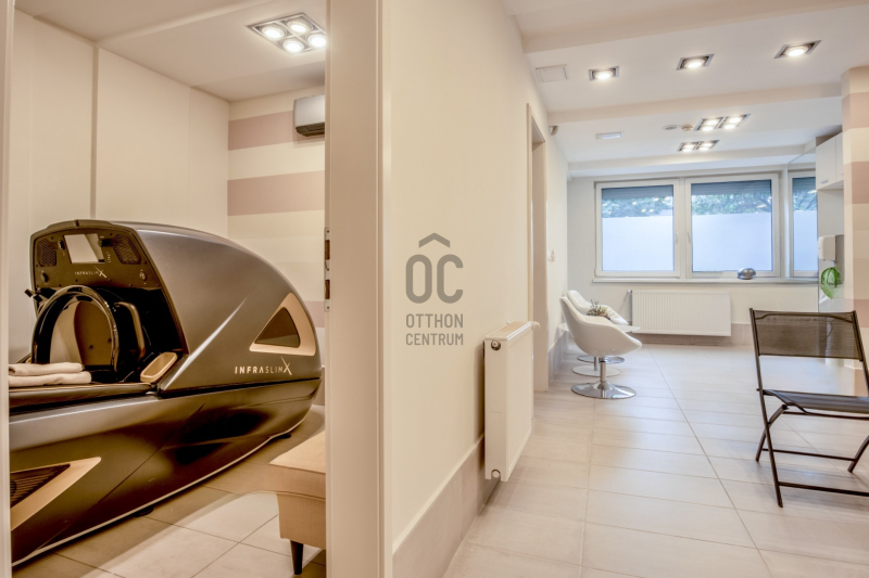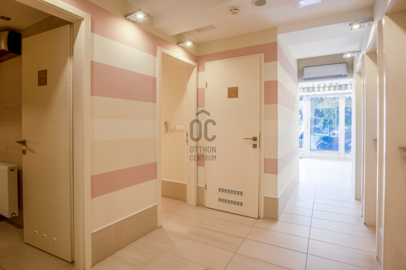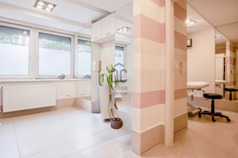 ✅ Felosztása jelenleg: recepció/előtér, teakonyha, öltöző, 3 toalett, közlekedő, 6 kezelő helyiség, szauna, szolárium helyiség, pihenő, terasz.