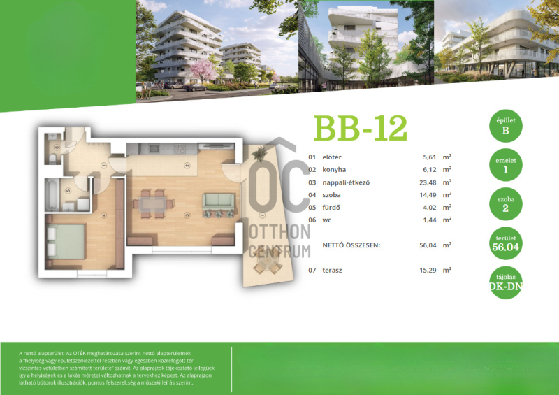 Az ingatlan nettó alapterülete 55,16 m² + 15,29 m² terasz.