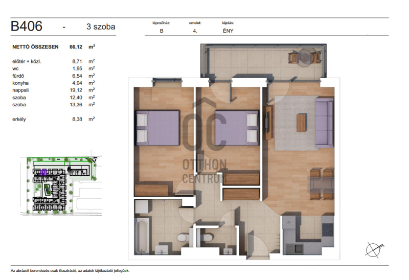 Az ingatlan nettó alapterülete 66,12 m² + 8,38 m² terasz.